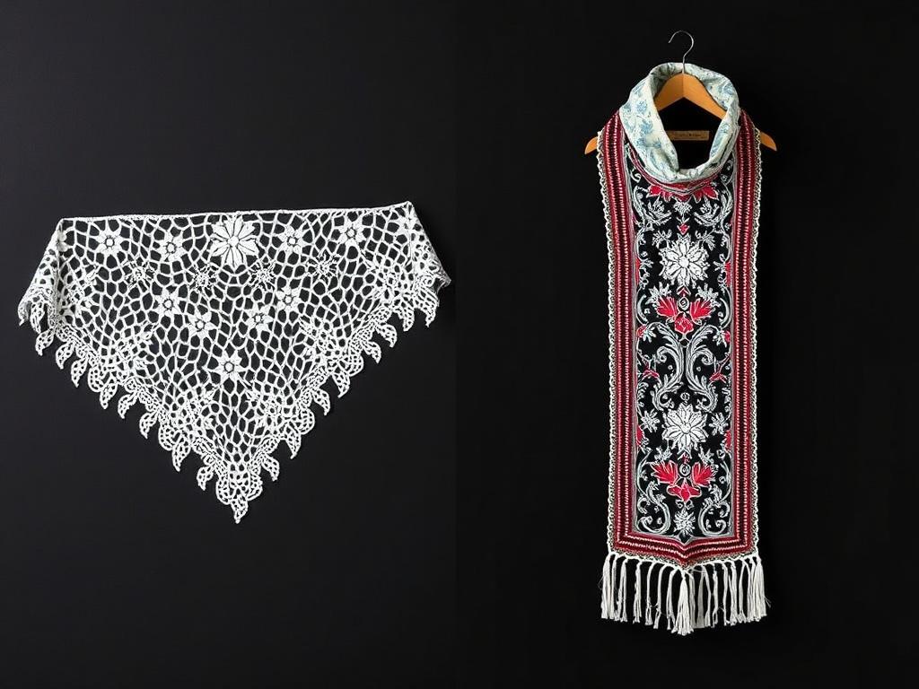 | Назначение | Скатерти, салфетки, кружева для домашнего интерьера; символ домашнего уюта и статуса хозяйки. | Шарфы и платки — тепло и стиль; часто как модный аксессуар или коллекционный предмет. |